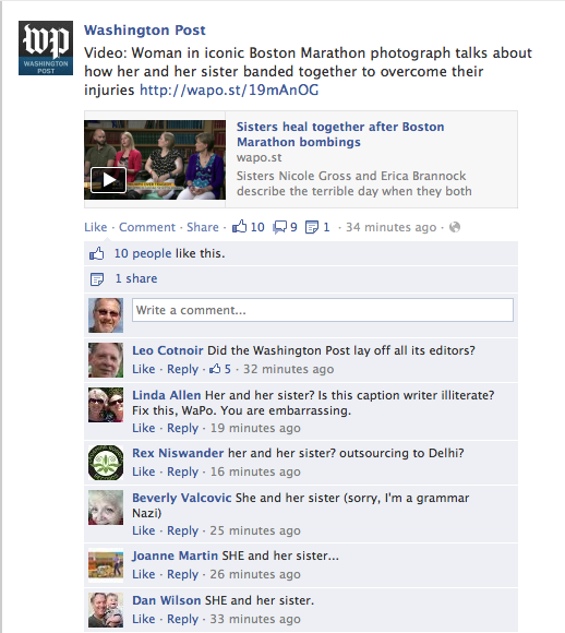 Us am appalled. Image Posted on May 29, 2013 by stephenbromberg How on earth does someone at the Washington Post write “Woman in iconic Boston Marathon photograph talks about how her and her sister banded together …” Share this:ShareTweet Click to email a link to a friend (Opens in new window) Email Like Loading... Related