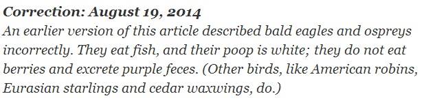 An earlier version of this article described bald eagles and ospreys incorrectly. They eat fish, and their poop is white; they do not eat berries and excrete purple feces. (Other birds, like American robins, Eurasian starlings and cedar waxwings, do.)