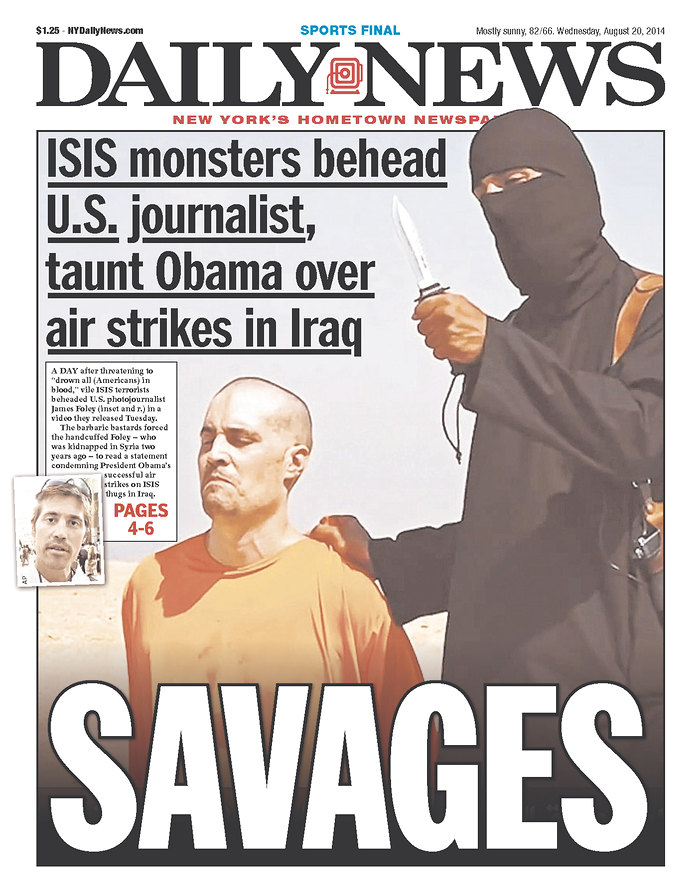 . . . On today’s front pages, the New York Post and the New York Daily News competed for the most tasteless tribute to the memory of journalist James Foley. Under matching headlines — “SAVAGES” — both covers feature clips from the video that reportedly show Foley in his final seconds . . .