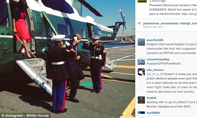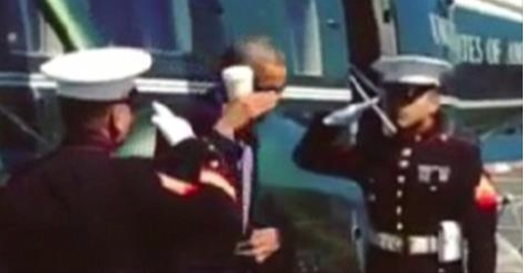 So the coffee goes in Obama’s right hand, and this presents a problem when it’s time to salute the two Marines greeting him on the tarmac. So he does what you or I do when we’re juggling a cup of coffee in the morning … like when we’re opening a door or pushing an elevator button. Obama improvises. He lifts his right hand, still holding the coffee cup, and delivers his salute.