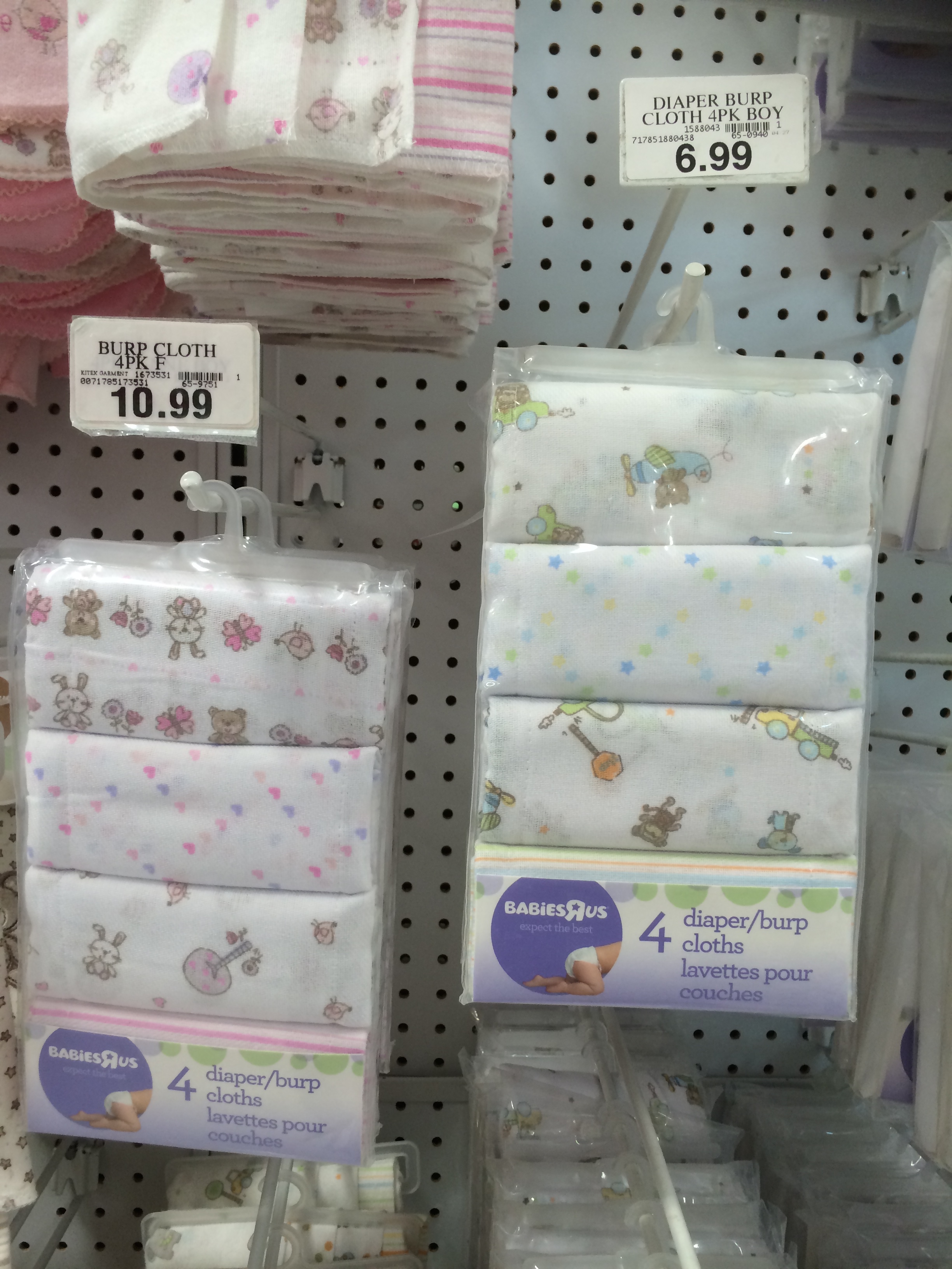 Hmmmmm indeed. Note the fine print. The pack of diaper/burp cloths on the right is for boys, and the pack on the left is for girls. The pack on the right has blue stars; the pack on the left has pink hearts. The pack on the right has trucks, planes and tools; the pack on the left has flowers, teddy bears and bunny rabbits. I reckon pink is a more expensive dye than blue or something. It’s either that or . . .